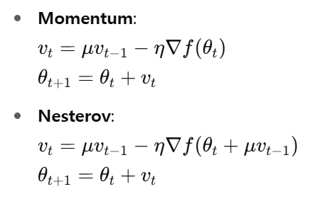 그냥 momentum보다 μv_{t−1} 만큼 앞의 기울기를 계산하여 정확한 방향, overshooting 감소