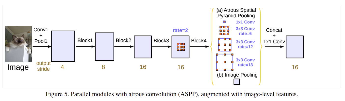 - ASPP(Atrous Spatial Pyramid Pooling)astrous convolution은 pooling 없이 receptive field 확보, 공간 해상도 손실 없이 성능 향상 가능